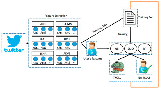 - Fornacciari, P.; Mordonini, M.; Poggi, A.; Sani, L.; Tomaiuolo, M. A holistic system for troll detection on Twitter. Comput. Hum. Behav. 2018, 89, 258–268. [Google Scholar] [CrossRef]