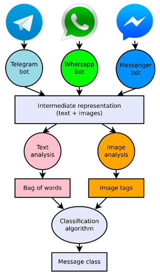 In collaboration with the Montecchio Emilia Municipality, we developed a comprehensive framework for managing reports sent to the local government by citizens through well-known instant messaging apps (WhatsApp, Telegram and Facebook Messenger). It leveraged a combined use of web systems and automated bots and, using machine learning techniques, it understood what kind of report the citizens wanted to send to the municipality from the received text and the associated image. Reports are automatically categorized in one of four predefined classes (environment, lighting, maintenance, and security), by a classification system based on text-analysis, image-recognition and object-detection. In this case we used three different acquirers that work as chatbots for report sources. Then, different pre-processors extracted features for the next text classifier and image classifier to create two different bag-of-words models (BoW). At the end, a unique classifier (engine actor) using a joint BoW model was trained for automatic categorization. To manage the entire system, we developed a web-based front-end in the form of an ad-hoc customer relationship management (CRM) system. Figure 5 shows the data flow describing the management of the citizen reports.