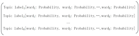 - Ramage, D.; Hall, D.; Nallapati, R.; Manning, C.D. Labeled LDA: A supervised topic model for credit attribution in multi-labeled corpora. In Proceedings of the 2009 Conference on Empirical Methods in Natural Language Processing, Singapore, 6–7 August 2009; pp. 248–256. [Google Scholar]