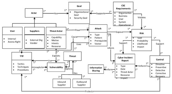 The meta-model shown in Figure 1 depicts the concepts and their relationships. A threat actor may want to attack the system and exploit vulnerable spots using TTP methods to manipulate the CSC system. CSC requirements are used to ensure the security goal, and constraints are achieved to meet the organizational goal. The attack entity is linked to the threat actor, TTP, risks, and threat, as the properties determine the nature of attacks and probable threats. The CSC requirements, risk, controls, and cyber incident report could have an effect on the organizational goal as well as the inbound and outbound supply chains. This interrelationship provides evidence of the degree of threat or cascading effect of how a particular risk could impact the CSC. The likelihood of an attack becoming a probable threat is determined by the threat intelligence gathered.