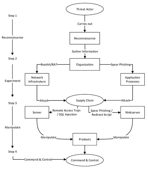 A supply chain (SC) is a collection of different organizations that align their business processes, goals, objectives, and some components of their systems to third party organizations, suppliers, consumers and partners [1,2]. Cyber physical systems (CPS) are the integration of computation and physical process that make a complete system, such as physical components, network systems, embedded computers, software, and the linking together of devices and sensors for information sharing [3]. The emergence of CPS, electronic transactions, third party vendors, and banking services have evolved over time and brought many changes to how the organizations and industries operate. CPS supply chains have also brought many challenges, such as lack of specific organizational threat intelligence gatherings, failure to audit third party vendors, lack of security controls, and lack of (cyber supply chain CSC )risk management. Cyber attacks could impact other supply chain partner systems due to many reasons such as software errors, vulnerabilities in any SC partner [4]. Examples include the Saudi Aramco electric-grid cyber attack in 2017, and the Ukraine power grid attack in 2015 [5]. These indicate that supply chain attacks are on the rise and require an attack model and threat analysis to gather threat intelligence [6]. There are existing attack models, such as MITRE’s kill chain model [6] that describe the actions an adversary could take to compromise and operate within an organization’s overall communication network. Attack trees [7] provide a formal and methodical way of describing the security of systems based on varying attacks. They use multilevel children within the attack tree, with a single root node that uses different ways to achieve its goal using leaf nodes and Building Security in Maturity Model (BSIMM) [8]. These works are important and contribute to the cyber threat modeling knowledge domain. However, there is a limited focus on supply chain perspective, and specifically on threats relating to inbound and outbound chain contexts that need adequate analyses to ensure CSC security.