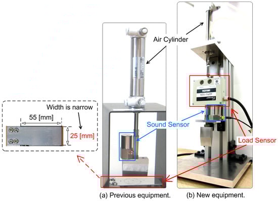 The load sensor used in our previous equipment [] was very narrow and fragile, as shown in Figure 1a, and could accommodate only small food specimens. The current paper developed equipment built from the ground up []. Figure 1b illustrates the system, in which the load sensor is attached to the top of the probe for examining differently sized food specimens. Rheometers are commonly used in food manufacturing companies for measuring the force response of the food []; nevertheless, rheometers are not built with a sound sensor, unlike our equipment. Therefore, we could regard our equipment as a next-generation rheometer capable of observing load change and sound signals simultaneously. The equipment is very simple, durable, user-friendly, and inexpensive. The novelty of the current study is emphasized on the fusion of our original simple equipment and the artificial neural network model. In particular, the proposed model considers both the sound and load.
