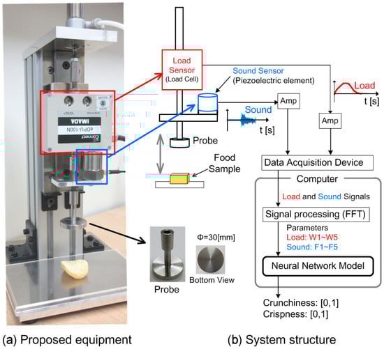 System construction: (a) Image of the proposed equipment and; (b) system structure for estimation of “crunchiness” and “crispness” textures.