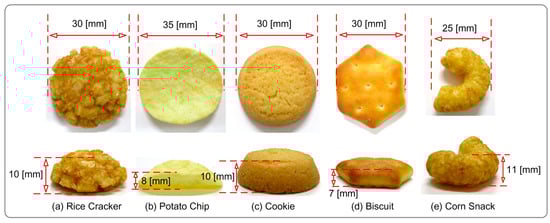 Rice crackers, potato chips, cookies, biscuits, and corn snacks purchased from a local supermarket were the food specimens evaluated by the system (Figure 4).