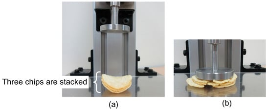 Images of stacked potato chips under equipment evaluation: (a) Three stacked potato chips prior to evaluation and; (b) potato chips being crushed.