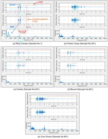 The experiment of each sample was conducted 200 times, for a total of 200 data. The samples are numbered accordingly, as illustrated in Table 1. Figure 6 displays graphs of five specimens of the experiment. The graph at the top illustrates the curve of the load (red line) and the sound (blue line), as shown in Figure 6a, which indicates that as the probe touched the sample, the load increased and a loud sound occurred. The middle graph in Figure 6a shows automatically extracted signals for 2.0 s; the extraction method is explained in the following paragraph. By focusing on the 2.0 s period while the snack is being pressed, we do not have to consider the noise influence except at the 2.0 s period. The bottom graph in Figure 6a shows the FFT (Fast Fourier Transform) results of the extracted 2.0 s sound data. Likewise, the results for the potato chips, cookie, biscuit, and corn snack samples are displayed in Figure 6b–e, respectively.
