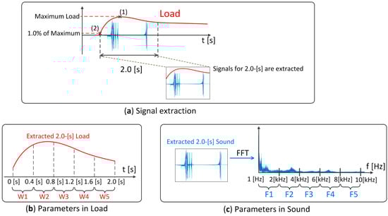 Signal Processing: (a) 2.0 s signal extraction; (b) parameters W1–W5 and; (c) parameters F1–F5.