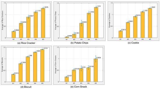 The average and standard deviations (STDs) of W1–W5 for (a) the rice cracker; (b) potato chips; (c) cookie; (d) biscuit and; (e) corn snack.