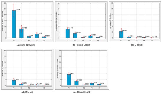 Averages and STDs of F1–F5 for (a) the rice cracker; (b) potato chips; (c) cookie; (d) biscuit and; (e) corn snack.