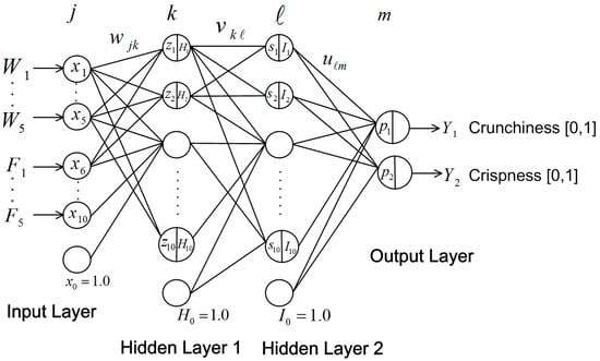 The neural network model for texture degree estimation is shown in Figure 10. The input layer comprises 10 nodes for W1–W5 and F1–F5, and a bias node. Hidden layers 1 and 2 comprise 10 nodes and a bias node, respectively. The output layer comprises two nodes expressing the degree range (0,1) of “crunchiness” and “crispness”.