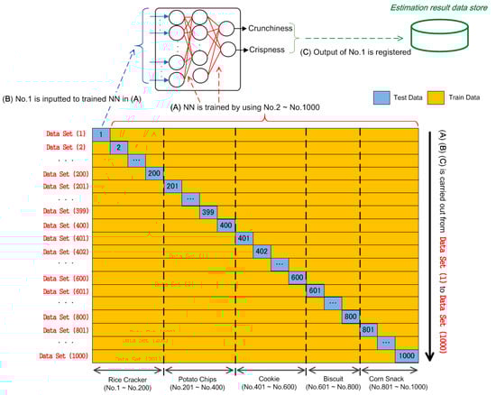 For Data Set (1), initially, (W1–W5, F1–F5) of sample Nos. 2–1000 were used for training the connection weights of the neural network in step (A). Subsequently, (W1–W5, F1–F5) of No. 1 were inputted to the trained network in step (B). Finally, crunchiness and crispness outputs of the network were registered in the estimation result data store in step (C). Similarly, (A)–(C) were repeated from Data Sets (2)–(1000). This Leave-One-Out Cross-Validation (LOOCV) was thus considered as 1000-fold cross-validation. The above procedure could be explained as follows: