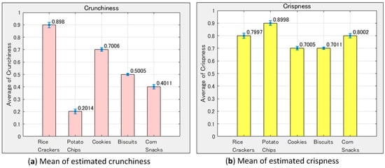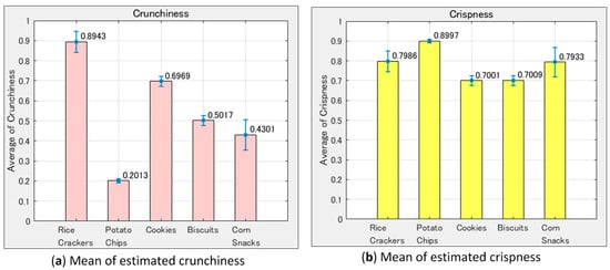 Texture evaluations of the samples using data sets of Figure 13: (a) The mean of estimated crunchiness degree and (b) crispness degree.