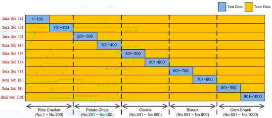 where, is assigned for the rice crackers, is assigned for the potato chips, is assigned for the cookies, is assigned for the biscuits, and is assigned for the corn snacks. These values were in accordance with Table 1.