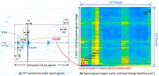 The input image (227 × 227 RGB) comprises the spectrogram and visualized load intensity (Figure 16b), which are obtained from extracted 2.0 s signals (Figure 16a). FFT is performed in each section from (1)–(19), as shown in Figure 16a, where the period of each section is 0.2 s, and then there are 0.1 s overlaps between the adjacent sections. FFT results of (1)–(19) are visualized, as shown in Figure 16b. In addition, this image also includes information in the load intensity, which is visualized in the bottom part of the image.
