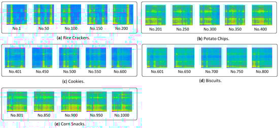 Images inputted to CNN: (a) Rice crackers; (b) potato chips; (c) cookies; (d) biscuits and; (e) corn snacks.