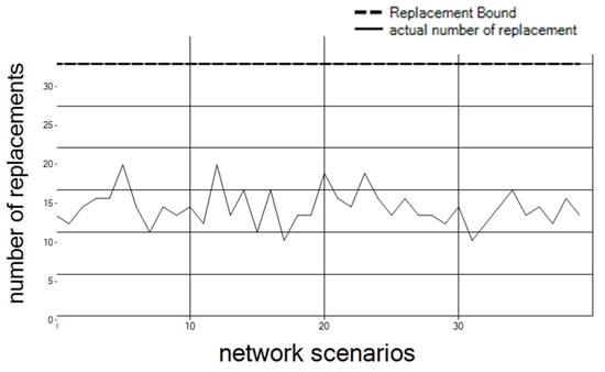 Figure 8, the actual replacement number is lower than the bound. The results are for 30 controllers and 10 clusters over 40 different network scenarios (as explained above for