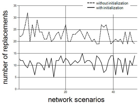 Figure 10 depicts the number of replacements required, with and without initialization of step 1. The results are for 75 controllers and 15 clusters over 50 different network scenarios.