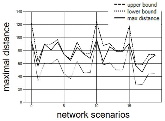 Figure 11 shows the final maximal distance that remains within the upper and lower bounds. The results are for 30 controllers and 10 clusters with offset 20 over 30 network scenarios.