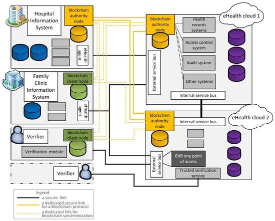 In the BEIM, we assume that the eHealth system is designed using a service-oriented architecture. Hospitals, medical centers, or general practitioners (GPs) might internally use software for managing medical records from different vendors that is compliant with the eHealth system. Therefore, a blockchain could be added to existing systems with minimum work (see Figure 1). There are two types of nodes, authorities and client nodes. In the proposed model, the authorities are nodes located inside eHealth clouds, and in major hospital information systems. Smaller hospitals and GP offices that store some medical records can only run client nodes. Authority nodes run a blockchain protocol, and client nodes store only a copy of the blockchain. Thus, the model can be deployed in all types of healthcare sites. In Figure 1 the yellow connections are secure logical links used for running a blockchain protocol. The dotted yellow lines show secure links used by client nodes to download and synchronize the current blockchain.