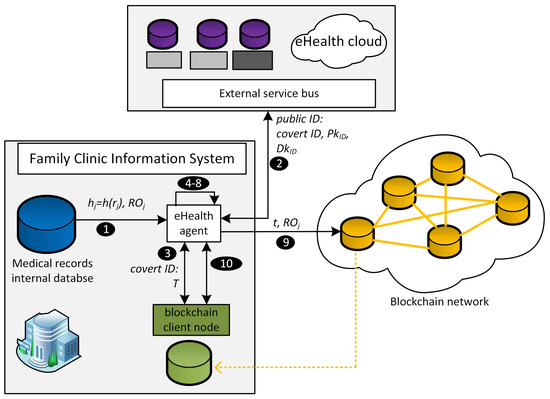 Security issues related to cryptocurrencies and PoA properties mean that, in practice, only PBFT blockchains (e.g., Hyperledger Fabric v0.6) can be used to secure eHealth systems. Another security aspect of blockchain usage is the privacy of the stored data. Privacy is ensured by using an encrypted transaction body and a covert identifier. A verifier must have access to all transactions in a blockchain related to a specified identifier, when they want to detect missing documents or logs. The map of covert identifiers to real identifiers is only available to entities that have an access right to the user’s EHR. As long as the covert identifiers are kept secret (they should be secured using the same security mechanisms that are used to secure access to the EHR), an adversary can only obtain general anonymous statistical data.