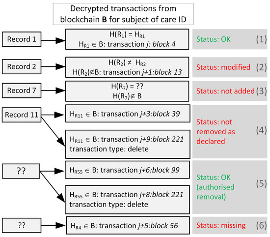 The first step in a verification procedure is to select transactions T that have specified a covert ID from blockchain B. Then, a verifier decrypts these transactions. In all cases, a verifier must have access rights to a user’s decryption key. Figure 3 shows different cases of integrity verification. On the left side are visible records from a user’s EHR. The middle part contains information when a hash from a given record matches a hash stored in blockchain B, and information in which j transaction in B, the record hash, is stored. On the left side, verification results are depicted. In the BEIM, it is possible to verify:
