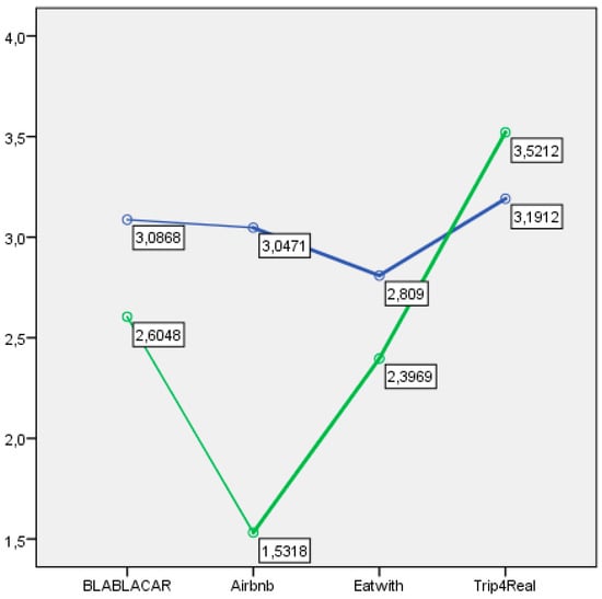 The Trip4Real platform awakened a greater interest in use than BlaBlaCar, though these were similar to Airbnb and Eatwith. However, younger participants (generation Z) demonstrated a higher interest in recommending Airbnb, in the way of confidence []. For Eatwith, the experimental group (with a goal based on a necessity) demonstrated a higher intention of being providers or offering this service than the control group.