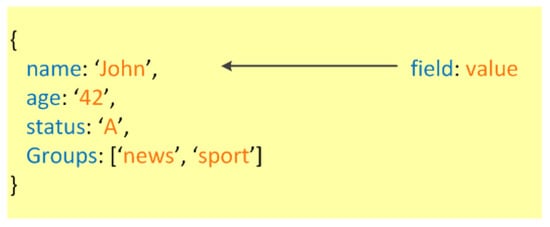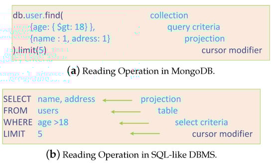A reading operation returns documents stored within MongoDB. A query specifies criteria or conditions to identify one or more documents in a collection, also specifying projection target fields. For this type of operation, MongoDB provides the db.collection.find () method that accepts criteria and projections as parameters in order to return a pointer to the result set of retrieved documents. From version 3.2, MongoDB supports left join operation among different collections by means of the lookup operator, but it does not support inner join operation among collections. To compare the complexity of the query language in different DBs, Figure 6a,b shows an example of reading operation respectively in MongoDB and in a SQL-like DBMS.
