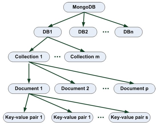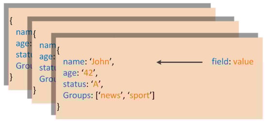The logical organization of data and documents in MongoDB is shown in Figure 4. A collections is a group of documents, which is the equivalent of a table in a SQL-like DB. Each collection belongs to only one DB. Collections do not enforce a data schema; actually, documents within a collection can have different fields. However, typically, documents in a collection have related purpose and share some fields. Figure 5 shows an example of MongoDB collection. A MongoDB DB is formed by a group of collections.