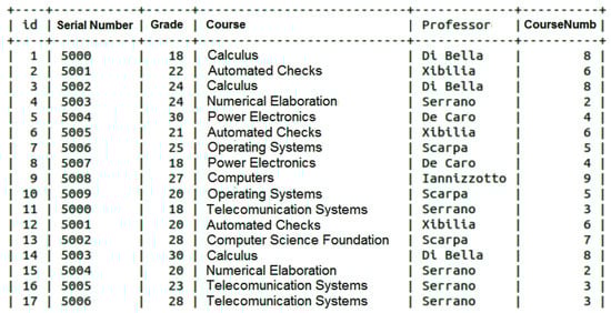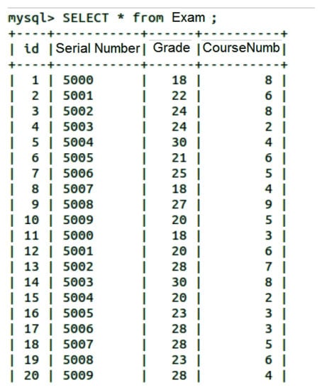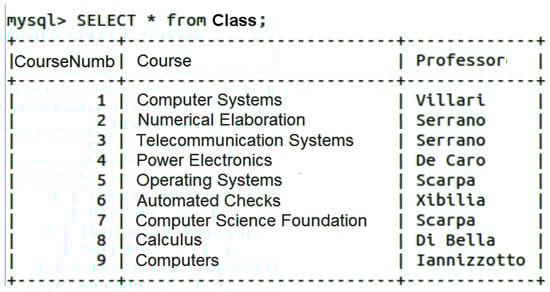Figure 9 shows an example of results of the SQL inner join operation performed on MySQL considering “Exam” and “Class” tables filtered by the “CourseNumb” field.