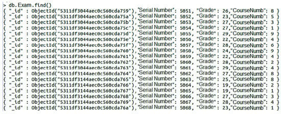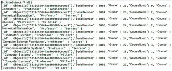 The MongoDB Inner Join procedure allows executing a query analogous to the one expressed in Listing 1. The result of the MongoDB Inner Join operation considering “Exam” and “Class” collections filtered by the “CourseNumb” field is shown in Figure 12.