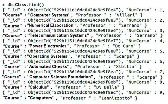 As it is well known, the natural join is a clause in the SQL language that combines tuples of two or more relations (tables) in a cartesian product, according to specific criteria applied on attributes. Although not supported, the natural join can be executed by an external third-party application written with whichever programming language supported by the MongoDB Application Program Interface (API), even at the cost of some additional operations. Listing 1 shows an example of inner join query considering “Exam” and “Class” tables whose instances are depicted respectively in Figure 7 and Figure 8 (only the first 20 rows).