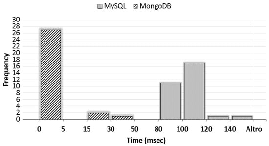 Figure 13 shows the histogram reporting the measured average insertion time. We can observe that the insertion of documents in MongoDB is very efficient in comparison with the insertion of records in MySQL. This is due to the scheme-free organization of data in MongoDB that allows storing information reducing processing and controls. In particular, since MongoDB does not present the control overhead due to foreign key constrains it offers better performance compared to MySQL. Thus, an insertion operation of a document in mymongodb takes roughly 5 ms whereas the same operation in mysqldb takes roughly 105 ms; so the insertion time on MongoDB is about is about the 4% of it on MySQL. The histogram shown in Figure 14 shows the distribution of measurements on insertion time in order to show how measured values spread in the range of measurements. This is an additional information respect to the estimation of the mean insertion time that asses the stable/unstable behavior of the system around the mean value. In particular, Figure 14 shows that the behavior of MongoDB is more stable that the one in MySQL with the most of measured time in the range [0–5] ms. In fact, how we can observe looking at the frequency histogram as far as MongoDB 27 repeated insertion tasks of 30 experienced an average response time ranging from 0 to 5 ms. Whereas, regarding MySQL we can observe that in 17 repeated insertion tasks of 30 we experienced an average response time ranging from 100 to 120 ms.
