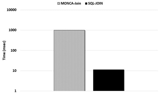 The second step of evaluation is related to the inner join operation. The inner join operation was performed in MongoDB by using Algorithm 1 implemented in Java language at application layer considering the same dataset previously discussed. In particular, we considered 1000 records/documents in “Class” table/collection and 9 records/documents in “Exam” table/collection for MySQL/MongoDB. As previously discussed, the added value of Algorithm 1 is to provide a new functionality that is not available for MongoDB. Here, we investigate its impact in terms of performance. On the testbed we performed:
