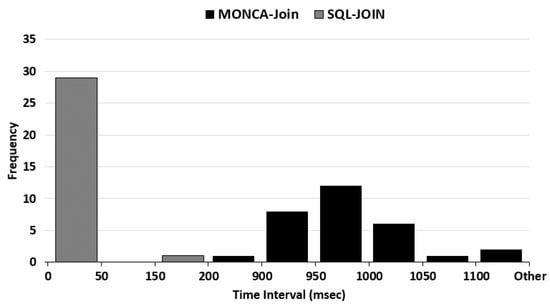 Frequency histogram showing response times of MySQL and MongoDB (application-layer) join operations.