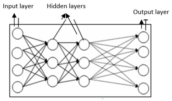 The most commonly found network structure is a type of network which is fed forwards or referred to as a feedforward network, since the connections established between neurons move in one direction only according to the following order: The input layer, hidden layer(s), and the output layer. For example, Figure 1 depicts a feedforward network with two hidden layers.