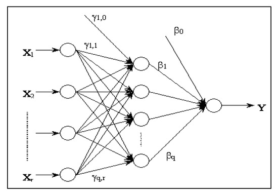 Specifically, the transformation process for the inputs and outputs in a feedforward artificial neural network with r inputs, a sole hidden layer, composed of q processing elements and an output unit can be summarized in the following formulation of the network output function for the following model (1) and in Figure 3: