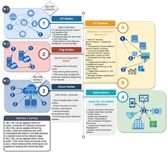 Figure 1 is organized by separating the infrastructure key elements in numbered blocks. Each block depicts a representative image of the described element, and arrows are linking the images with numbers, indicating how each element interconnects with the other blocks. Additionally, text blocks are included, giving the most important aspects of each key element in bullets. The IoT infrastructure consists of: (1) IoT nodes, namely the IoT devices (sensors and actuators) at the edge of the network. (2) The Fog nodes, servers that assist IoT devices by providing computing, storage, and advanced networking capabilities. (3) Cloud nodes that consist of data centers, which handle data storing, computationally intense data analysis using ML techniques, data sharing, etc. (4) IoT applications that use the collected and analyzed information to create services for the end user. Points (A) and (B) symbolize the IoT platforms, which have the orchestrator’s role and support the elements throughout the infrastructure in various ways as described in the figure. Moreover, Figure 1, presents the role of ML in the IoT infrastructure. ML techniques can be applied at the IoT nodes, the fog nodes, or the cloud nodes, depending on the application needs.