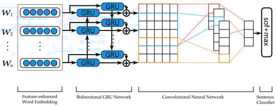The remainder of this paper is organized as follows. Section 2 presents the SDNN architectures for text sentiment classification in detail, including the feature-enhanced word-embedding module, bidirectional GRU network module, convolutional neural network module, and sentence classifier module. The experiment is introduced in Section 3. Section 4 presents the conclusions and discusses future work.