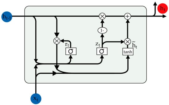 As for GRU, it is regarded as an optimization of LSTM, and it can not only merge the input gate and the forget gate of LSTM into the reset gate , but also optimize the update mode of the hidden state . In addition, the output gate corresponds to the update gate . Throughout this design, the GRU can maintain the advantage of the LSTM while having a simpler structure, fewer parameters, and better convergence than the LSTM [13]. As shown in Figure 3, at each time-step , the GRU transition functions are defined as follows: