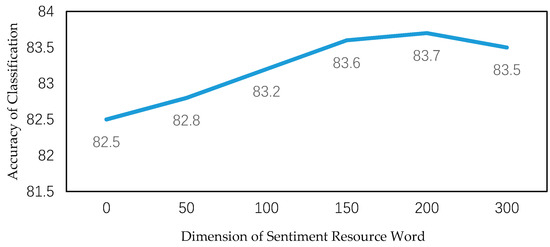 Since the sentiment attention mechanism was added in the word-embedding layer, in order to verify the influence of different dimensions of sentiment resource words on the classification accuracy, we used SDNN to analyze the accuracy under different dimensions on the MR dataset. The experimental results are shown in Figure 4.