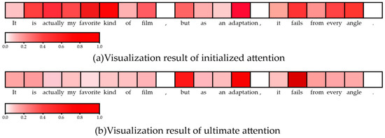 Comparison of initialized attention and ultimate attention. The attention score calculated by Equation (6) is used for the color-coding. The color depth indicates the importance degree of a word to the sentiment polarity of a sentence.