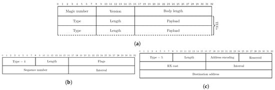 Babel relies on the computation, made by every pair of neighboring nodes A and B, of the link cost among A and B. Given a route between any two nodes, the route metric corresponds to the sum of the costs of all the links connecting A to B. However, Babel does not specify any algorithm for computing metrics and existing implementations are based on packet-loss metric on wireless links and a simple hop-count metric on all other types of links []. The goal of the Babel algorithm is to compute, for each source node S, the routes of lowest cost to S. In detail, a Babel node periodically broadcasts hello messages, embedded in UDP datagrams, to all of its neighbors, together with an I Heard You (IHU) message to every neighbor from which it has recently heard an hello. From the information retrieved from hello and IHU messages (whose packets are shown in Figure 3b and Figure 3c, respectively) received from B, node A computes the cost of the link from A to B. A key feature of Babel is its fast reaction to network changes; this is obtained through triggered updates, triggered retractions and explicit requests, in which a Babel node requests an action to be done from another node or a set of nodes.