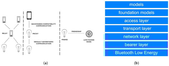 Examples of optional features within the Bluetooth Mesh standard and protocol stack. (a) Examples of optional features within the Bluetooth Mesh standard; (b) BLE protocol stack.