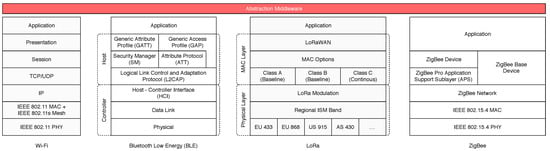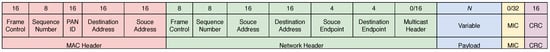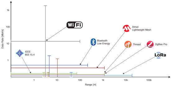 A relevant example of IEEE 802.15.4-oriented mesh protocol is given by ZigBee Pro [] (and its successor ZigBee 3.0 []), a very low-cost, low-power consumption, multi-band (across 2.4 GHz and sub-GHz—868 MHz and 915 MHz—bands), and two-way wireless standard that can be embedded in several scenarios, ranging from domestic appliances to security systems, environmental control, automated meter reading, industrial automation, and medical applications. ZigBee Pro can be considered as the network infrastructure standard for networks based on ZigBee products, together with being used for robust proprietary IoT implementations and enhancing the IEEE 802.15.4 standard by adding mesh network and security features along with an application framework, bringing to a full stack and inter-operable ZigBee solution [].