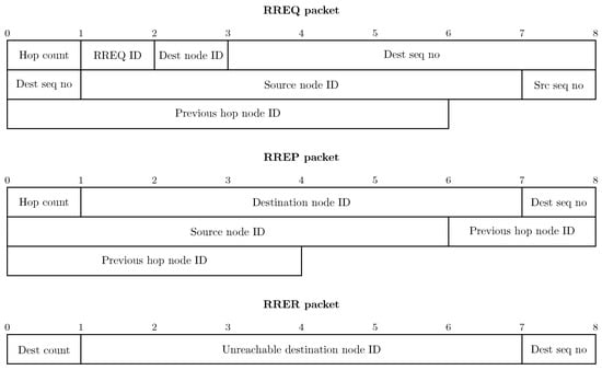 - Perkins, C.; Belding-Royer, E.; Das, S. Ad hoc On-Demand Distance Vector (AODV) Routing. RFC 3561, Internet Engineering Task Force. 2003. Available online: https://tools.ietf.org/html/rfc3561 (accessed on 15 April 2019).