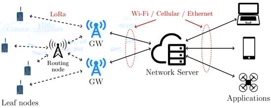 - Lundell, D.; Hedberg, A.; Nyberg, C.; Fitzgerald, E. A Routing Protocol for LoRA Mesh Networks. In Proceedings of the 2018 IEEE 19th International Symposium on “A World of Wireless, Mobile and Multimedia Networks” (WoWMoM), Chania, Greece, 12–15 June 2018; pp. 14–19. [Google Scholar] [CrossRef]