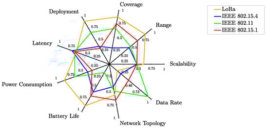 For example, in terms of scalability, from the values in Table A1 one can conclude that: for LoRa the value will be ; for IEEE 802.15.4 the value will be ; for IEEE 802.11 the value will be ; for IEEE 802.15.1 the value will be .