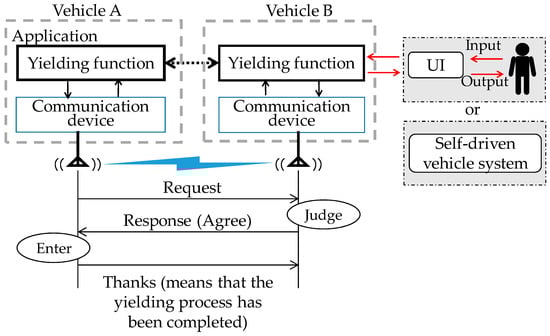 The authors previously proposed a yielding protocol in [] (hereafter referred to as the “former method”) and verified its operation using an experimental system, which consisted of Raspberry Pi computers mounted on radio control cars. However, the former method had problems with the message transmission efficiency and vehicle identification accuracy. The present paper presents an improved method. This section details the improved method. The sequence of the yielding process is the same as the former method and is shown in Figure 1. Vehicle A sends a request. Vehicle B receives the request, makes a decision, and agrees to yield. Vehicle A proceeds to the intersection and sends a thanks message. The yielding protocol begins when a low-priority vehicle comes near the intersection, or when a priority vehicle wishing to turn right into a low-priority road is at the head of the line of vehicles and is running at a reduced speed or at a halt. Self-driven vehicles operate in accordance with this yielding process. Drivers in human-driven vehicles make the final judgment about driving and input their intentions by using a user interface (UI).