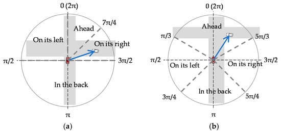 Determining the relative position of the communicating vehicle. The red vehicle is the own vehicle and the white vehicle is the other vehicle. (a) The own vehicle is the requesting vehicle; (b) the own vehicle is the responding vehicle.