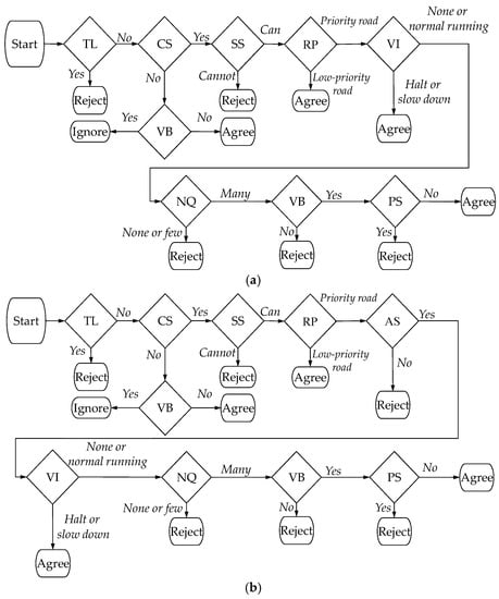 Yielding decision flow. TL: Traffic light; CS: Conflict situation; SS: Stop safely; RP: Road priority; VI: Vehicle beyond the intersection; VB: Vehicle in the back; NQ: Number of queuing vehicles; PS: Pedestrians in the surroundings; AS: Availability of enough space. (a) Patterns 1 and 4; (b) patterns 2 and 3.